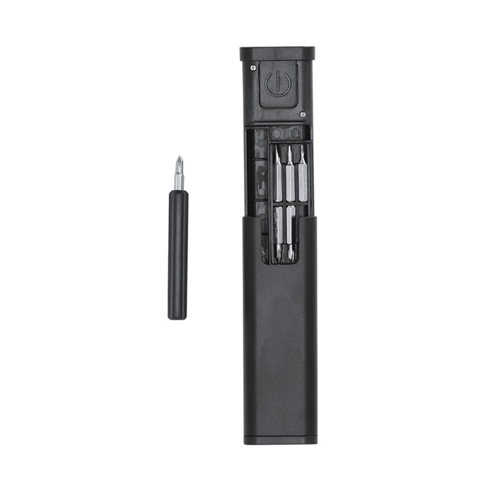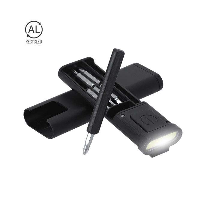Werkzeugset aus recyceltem Aluminium im kompakten 2-in-1-Format. Das Etui in Taschenlampenform verfügt über 4 LED-Leuchten und ein Innenfach, in dem 6 Werkzeuge aufbewahrt werden, die für schnelle Anpassungen im Büro oder unterwegs gedacht sind. Enthalten ist ein Multifunktionsgriff, kompatibel mit Kreuz- und Schlitzaufsätzen, um die gängigsten Anwendungen abzudecken. Der Clip erleichtert das Mitführen in der Tasche oder im Rucksack, und die Knopfzellen sind enthalten, sodass Sie es ab dem ersten Tag verwenden können. Empfohlen für Markenaktionen bei Veranstaltungen und zur Begrüssung neuer Mitarbeiter.