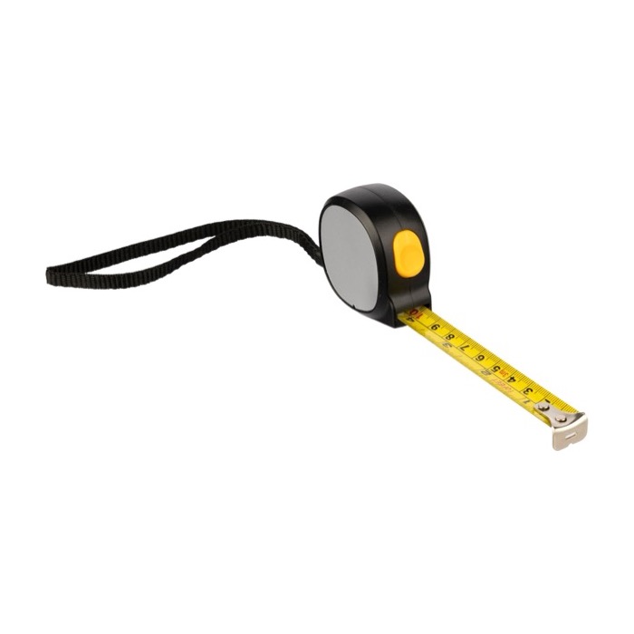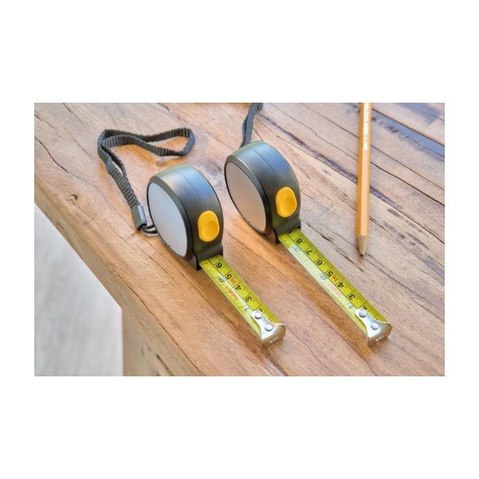 Bandmaß aus Kunststoff mit magnetischer Seite, um es an Metalloberflächen zu befestigen und die Messung immer griffbereit zu haben. Es verfügt über ein 16 mm breites und 3 m langes Metallband mit Markierung in Zentimetern und Zoll, um mit unterschiedlichen Standards zu arbeiten. Der obere Schieber ermöglicht das schnelle Arretieren und Lösen des Bandes, und die Polyester-Handschlaufe sorgt für eine sichere Handhabung unterwegs. Nützlich für Markenaktionen auf Messen und für technische Teams.