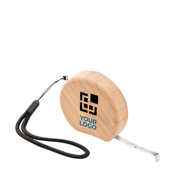 Flexometer mit Logo bedrucken. Es hat ein Bambusgehäuse und Riemen und ist ein nützliches, kompaktes Werkzeug, da die Gesamtlänge des Riemens zwei Meter beträgt.