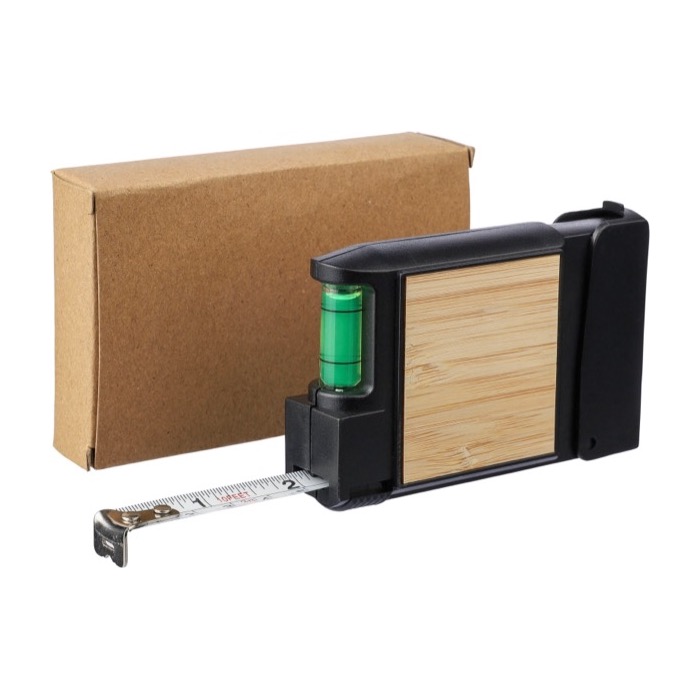 ABS Maßband mit Bambusdetails und Skala. Länge 3 m. Enthält 5 Bits zur Verwendung als Schraubendreher. 12 mm Metallsplitter. Einzeln verpackt in braunem Karton.