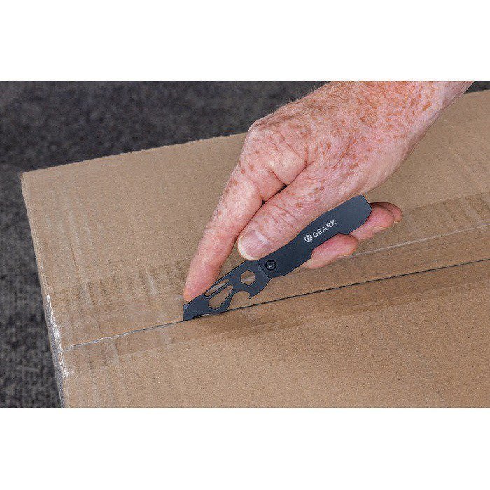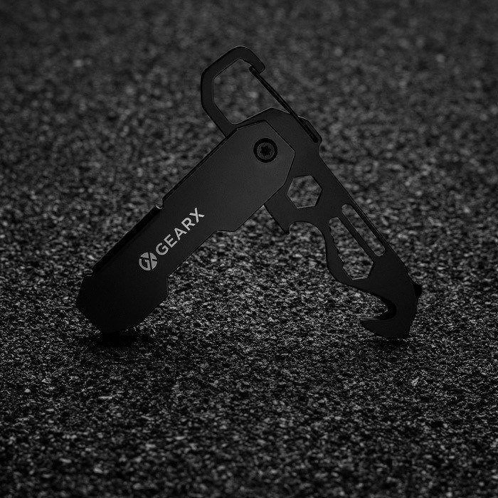Klappbares EDC-Werkzeug Gear X aus rostfreiem Stahl 420. Bietet 11 Funktionen: Schraubenschlüssel M5, M4, M3,5, M2,5, M2 und M1,6, Schlitzschraubendreher, Kreuzschlitzschraubendreher, Cutter, Flaschenöffner und Haken. Seine Maße betragen 9,1 cm zusammengeklappt und 12,8 cm aufgeklappt. Mit integriertem Karabinerhaken zur Befestigung und in FSC-zertifizierter Verpackung.