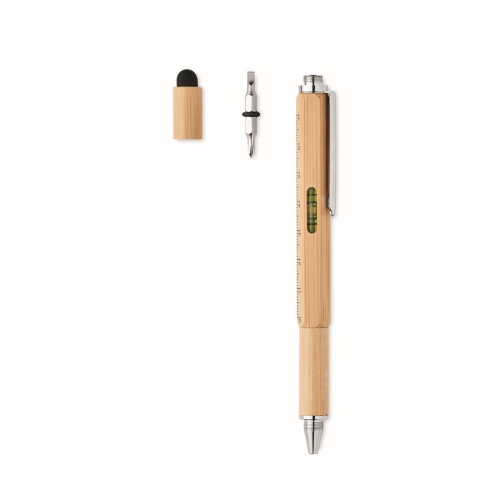 Drehkugelschreiber mit Stylus, aufgedrucktem Lineal (7cm) und Mini-Wasserwaage (Gimmick) sowie integriertem Kreuz- und Schlitzschraubenzieher. Bambus-Gehäuse. Blaue Tinte.