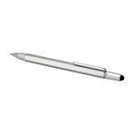 Der Dora Multifunktionskugelschreiber aus Aluminium besteht teilweise aus recyceltem Material und ist mit einem doppelseitigen Lineal, einer Wasserwaage, einem Schraubendreher, einem Neigungsmesser und einem schwarzen Stylus aus Gummi ausgestattet. Der Schaft besteht aus recyceltem Aluminium mit einer silbernen Sprühbeschichtung. Der Clip ist aus Eisen. Der Schraubenzieher ist aus Stahl. Der obere Teil und die Spitze sind aus RABS gefertigt. Tintenfarbe: Schwarz. Schreiblänge: 400 Meter. Strichstärke: 1,0 mm.