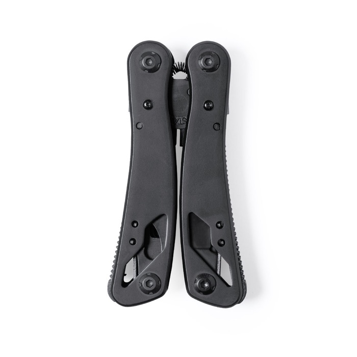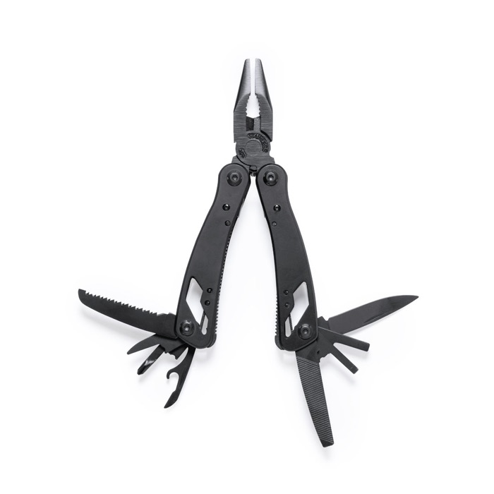 Multitool mit Zubehör aus rostfreiem Stahl mit schwarzem Finish und passendem, widerstandsfähigem Aluminiumgriff. Mit 12 Funktionen, darunter Messer, Schraubendreher, Feile, Öffner und Zange. Zusammenklappbar und kompakt in der Größe, präsentiert in einer individuellen Box in schwarzem Design.