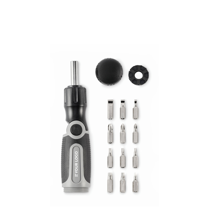 Klappbares Schraubendreher-Set mit ABS-Griff und 12 Eisen-Bits für grundlegende Wartungsarbeiten. Enthält Phillips-, Schlitz-, Sechskant- und Torx-Bits, ausgelegt für gängige Verschraubungen an Geräten, Möbeln und kleinen Installationen. Das Klappformat hilft, sie ordentlich zu halten, und erleichtert den Transport im Rucksack, Auto oder Werkzeugkasten. Griff mit gutem Halt für den täglichen Einsatz im Lager oder im technischen Büro. Empfohlen als Firmengeschenk für Messen, Willkommens-Kits oder interne Aktionen.