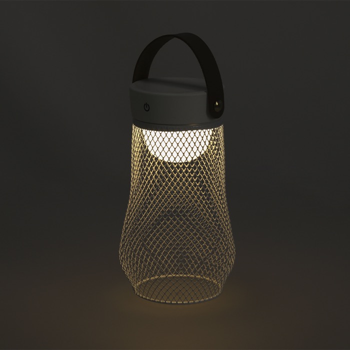 Designlampe aus Metall mit weichem PU-Tragegriff. Drei Lichtmodi (weiß, neutral, warm) und 24 LEDs. Für Innen- und Außenbereiche geeignet. Mit Touch-Schalter zum Ein-/Ausschalten und zur Moduswahl. Eingebaute 1.200-mAh-Batterie, wiederaufladbar über Typ-C-Anschluss.