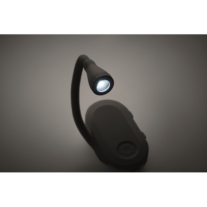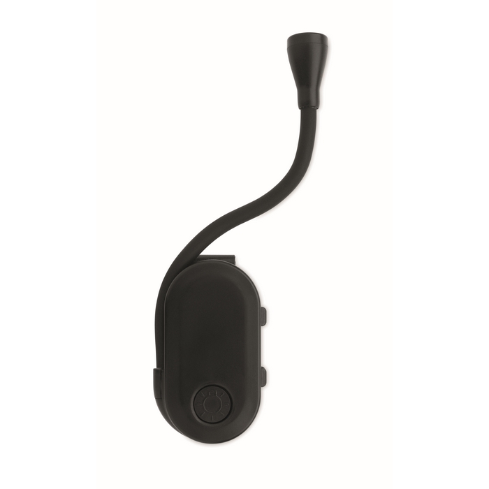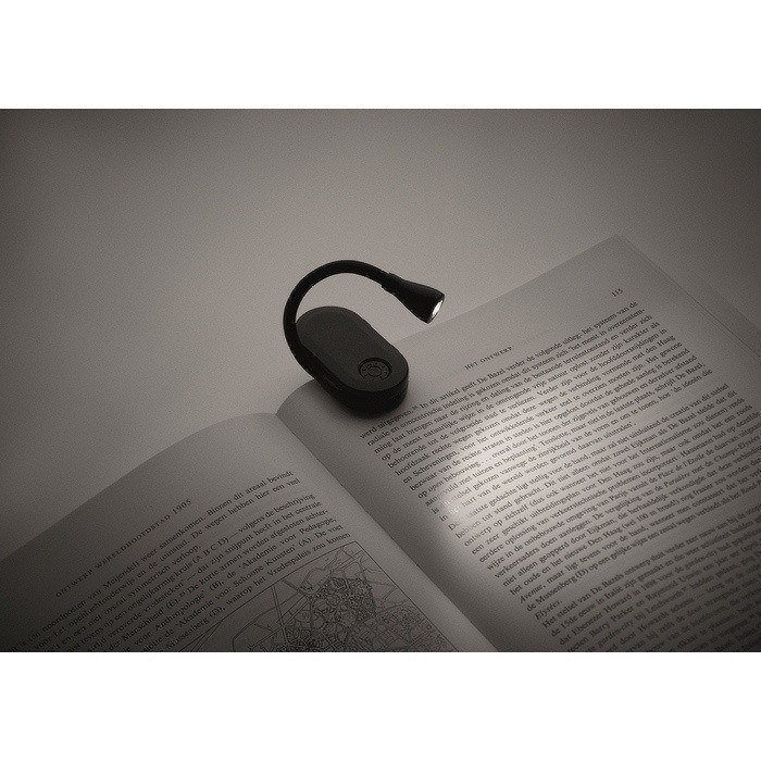 Wiederaufladbare LED-Leselampe aus ABS mit flexiblem Körper und Clip zum Befestigen an Büchern, Notizbüchern oder Bildschirmen. Sie bietet 3 Lichteinstellungen für unterschiedliche Lese- oder Arbeitssituationen sowie einen integrierten 300 mAh Akku für den täglichen Einsatz im Büro oder auf Reisen. Das kompakte Design erleichtert das Verstauen und den Transport. Praktische Option für Willkommens-Kits, interne Events oder Branding-Aktionen.
