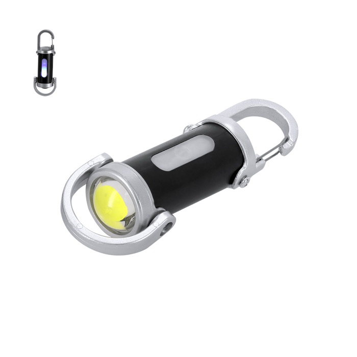 Taschenlampe aus Kunststoff mit Transportkarabiner und unterem Tragegriff, zum Aufhängen oder in der Hand tragen. Sie verfügt über 4 LEDs und 8 COB-Leuchten, mit Ein-/Aus-Taste und 7 Beleuchtungsstufen, sowohl dauerhaft als auch blinkend, um sich an unterschiedliche Situationen anzupassen. Integrierter wiederaufladbarer 400mAh-Akku; geliefert mit USB-C-Ladekabel (Universal Serial Bus Typ C) mit 5V. Praktisches Hilfsmittel für Markenaktionen auf Messen, für das Verkaufsteam oder für die interne Ausstattung.