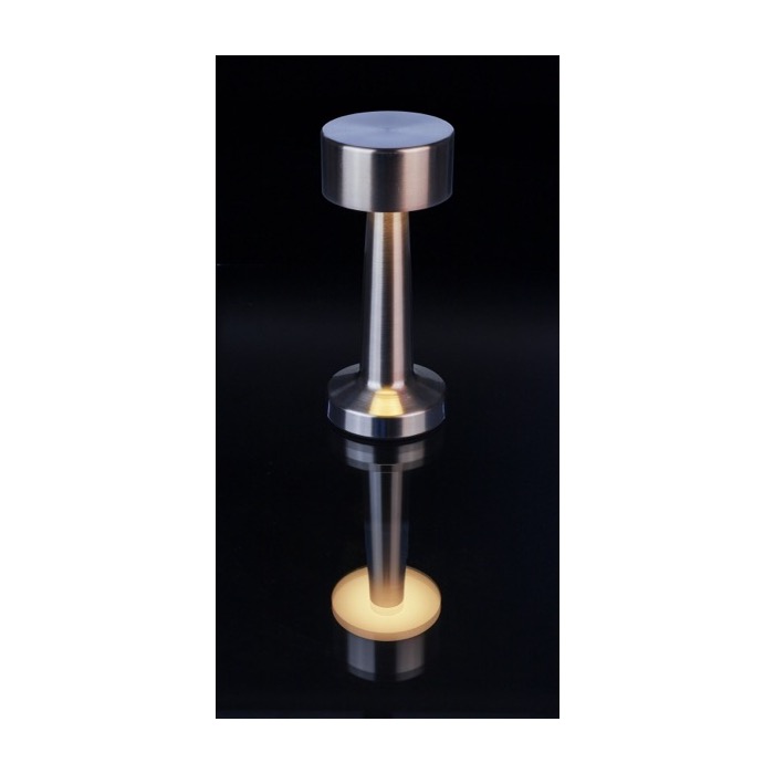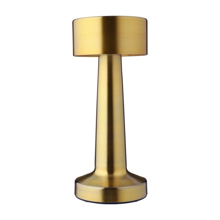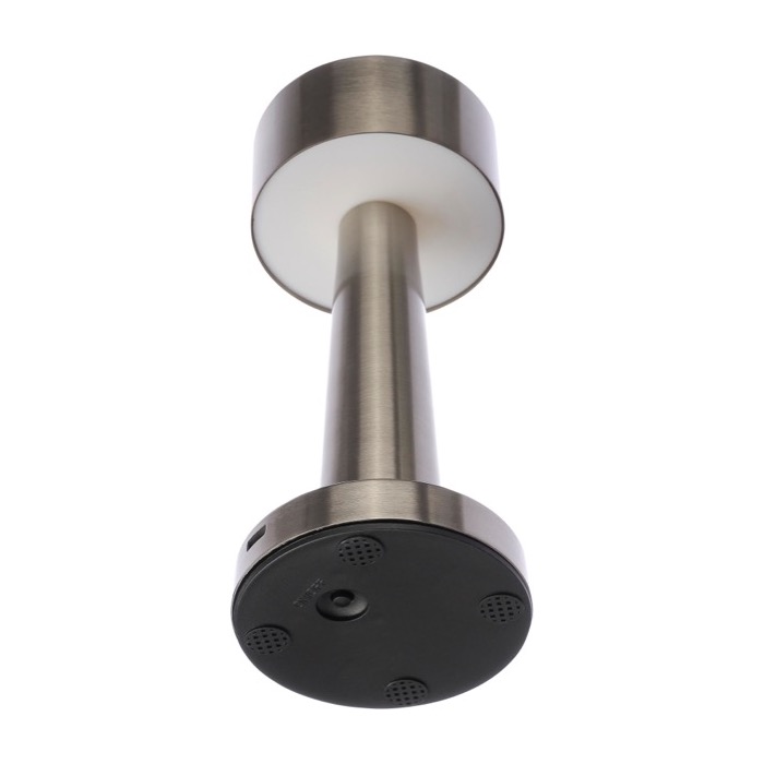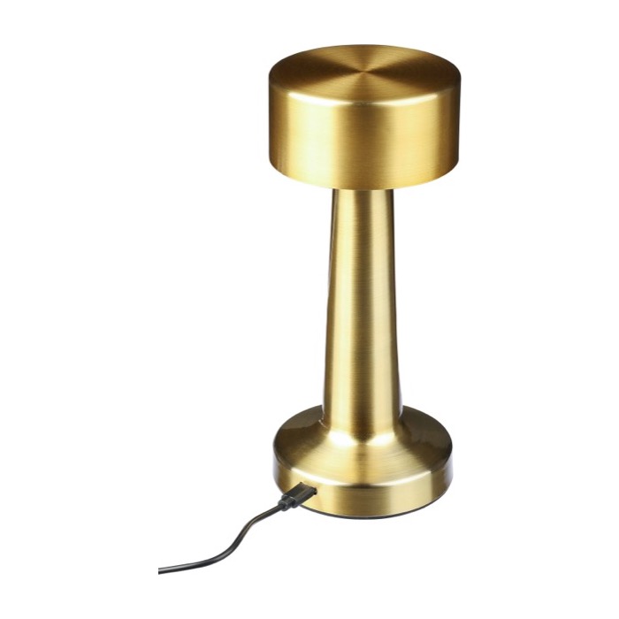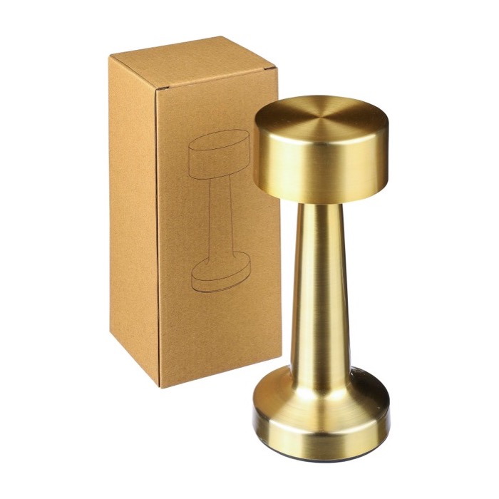 Tischlampe aus Metall und ABS mit 24 LEDs und drei Lichtmodi (weiß, neutral, warm), gesteuert über Touchsensor oben. Mit 800-mAh-Akku, USB-C-Ladung, 1-m-Kabel. Dimmbare Lichtmodi, An/Aus-Schalter unten. Geliefert in brauner Kartonbox