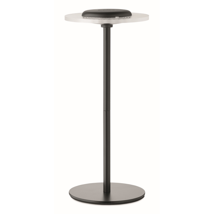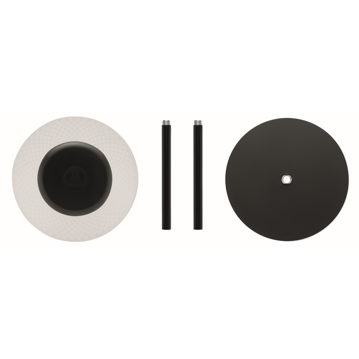 Tischlampe aus Eisen mit RGB-Beleuchtung und 39 LED-Lichtern für vielseitige Innenanwendungen. Sie verfügt über eine stufenlose Helligkeitsregelung, um das Lichtniveau je nach Situation anzupassen, wahlweise mit warmem Licht oder Farbwechsel. Integrierter wiederaufladbarer 2000-mAh-Akku mit einer Laufzeit von bis zu 6 Stunden für Bereiche ohne nahe Steckdose. Empfohlen für Empfänge, Besprechungsräume oder Branding-Aktionen bei Events.