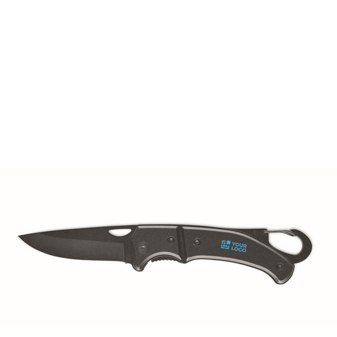 Einfaches Klappmesser mit Karabinerhaken für einen bequemen Transport. Es ist das ideal Werbemittel für ein abenteuerlustiges Zielpublikum.