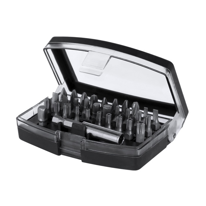 Werkzeug-Set mit Kunststoffetui, gedacht für Präzisionsarbeiten im Büro, für Wartung und technischen Support. Enthält einen Adapter und 32 magnetische Aufsätze mit verschiedenen Bits: Kreuzschlitz, Stern, Schlitz, Sechskant und Torx, um die meisten gängigen Schrauben an Geräten und kleinen Ausrüstungen abzudecken. Das kompakte Format hilft Ihnen, alles ordentlich und griffbereit in der Schublade oder im Rucksack zu verstauen. Gute Option für HR-Aktionen, Messen oder Unternehmens-Merchandising mit Ihrem Logo.