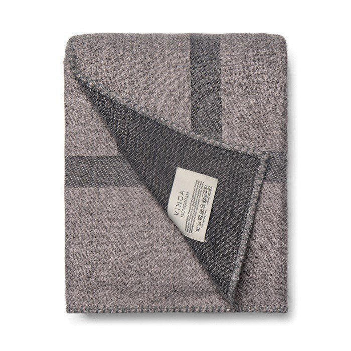Elegante, weiche Decke mit luxuriösem Griff und doppelseitigem Design in kontrastierenden Tönen mit invertiertem Monogramm-Muster. Maße: 170 × 130 cm, Gewicht: 260 g/m². Maschinenwaschbar für einfache Pflege. Hergestellt aus 97 % recyceltem Polyester und GRS-zertifiziert, was die Rückverfolgbarkeit der recycelten Materialien in der gesamten Lieferkette garantiert.